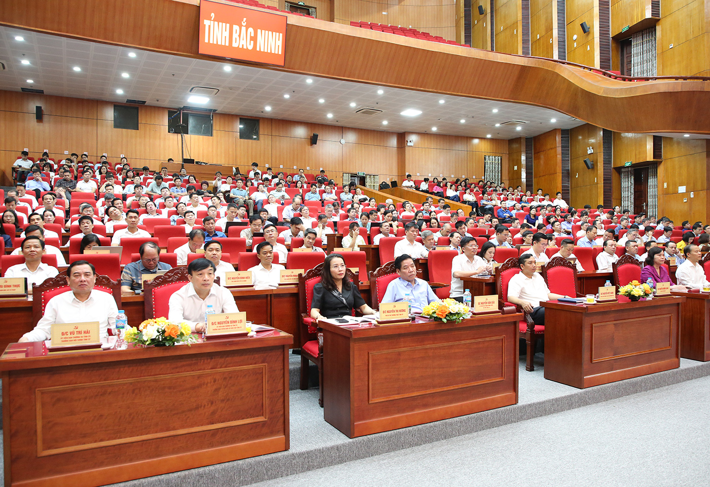 Từ trái qua: Trưởng Ban Nội chính Tỉnh ủy Vũ Trí Hải; Trưởng Ban Tuyên giáo và Dân vận Tỉnh ủy Nguyễn Đình Lợi; Phó Bí thư Thường trực Tỉnh ủy Nguyễn Thị Hương; Bí thư Tỉnh ủy Nguyễn Văn Gấu; Chủ tịch HĐND tỉnh Nguyễn Việt Oanh dự hội nghị tại điểm cầu tỉnh Bắc Ninh.